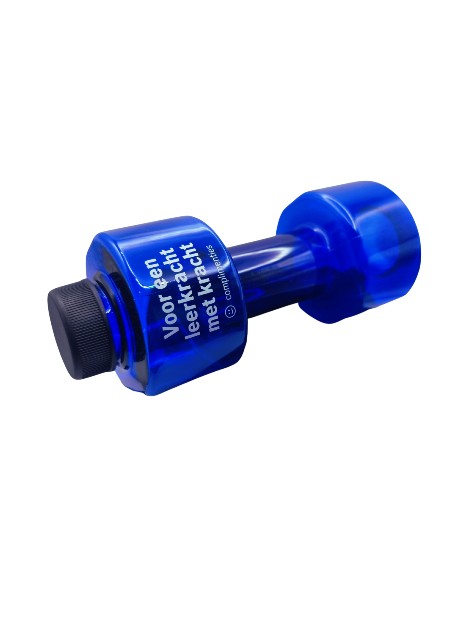 De dumbbell-waterfles heeft een inhoud van 550 ml. Na een paar slokjes is hij ook geschikt voor lichte krachttraining.